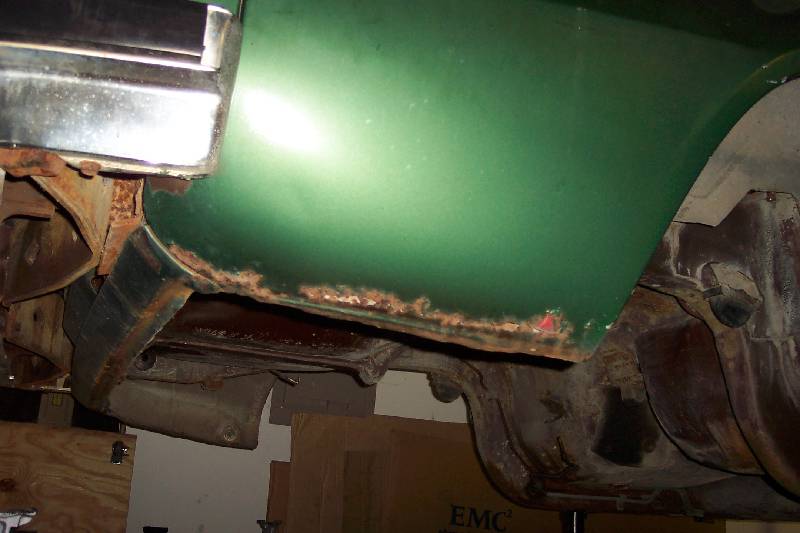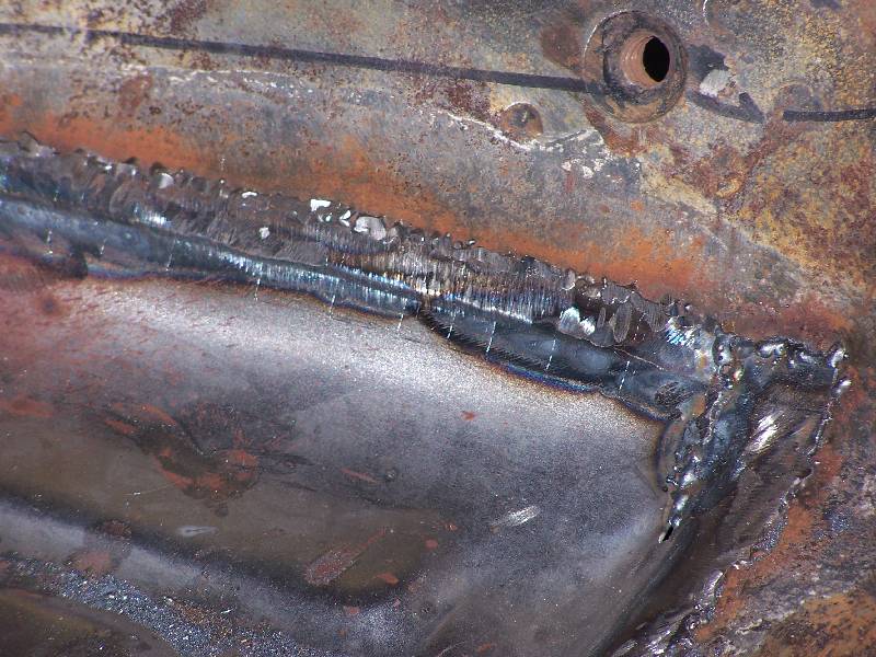This was my first shot at MIG welding, and I did well enough to get the job done. Not real pretty, but the pan is in. I found that sticking two peices of metal together and welding are two different things, although once I figured out that the wire feed was not working right and fixed it, it went a WHOLE lot better. I took a 4 " grinder and knocked the welds down a bit for looks. I had the car up on Rhino ramps, but still, welding on your back under the car is a P-A-I-N.