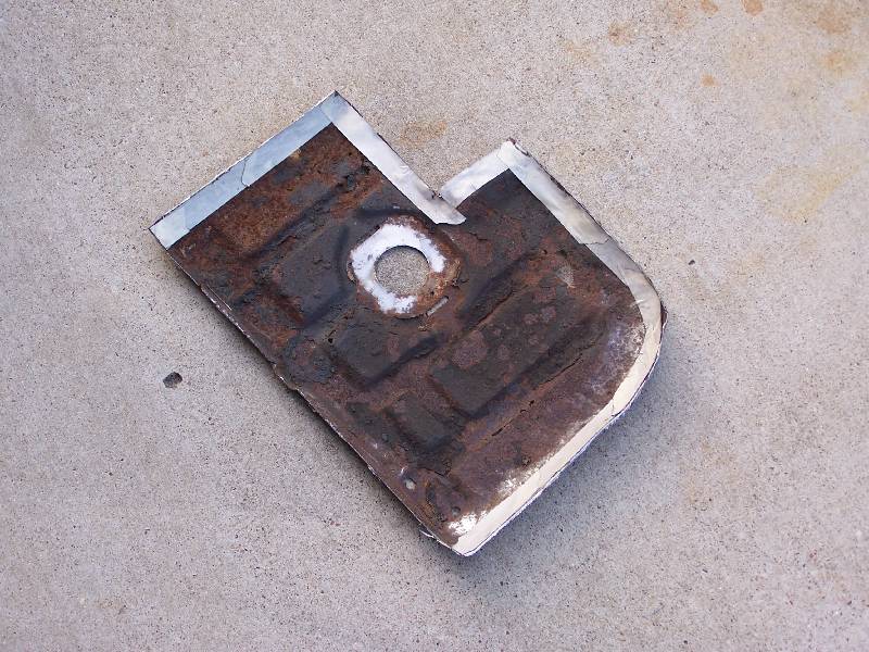 Here you can see what the rust looked like in the original floorpan. I laid out a line with masking tape, and used an air cut-off tool to remove the damage. Be aware of any supports that you don't want to cut through, like in the third picture. I then took the new pan, which I got from CARS, Inc., and laid it into place. I weighted it down and traced a line with a Sharpie. On the bench, I traced another line a half inch "up" for the overlap, as in the fifth picture.