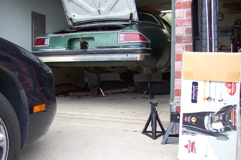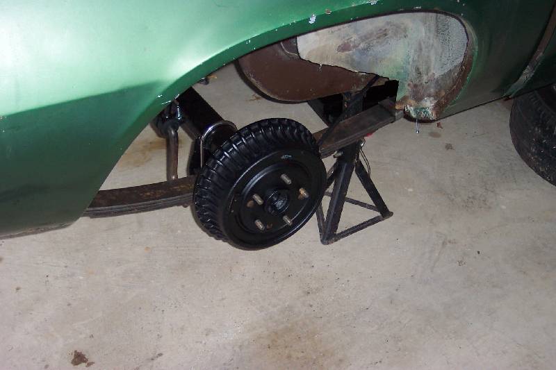 The rear suspension rebuild involved pulling the old rear out, cleaning it up and painting it satin black. The rear has had a 3.08 Posi installed at one time, despite the rear cover stating that it is a 3.73. The stock 5 leaf springs were rated 90 lbs per inch, and the replacement 4 leaf springs were calculated to rate at 125 lbs per inch. As you can see in the fourth picture, the 4 leafs have much less arch than the stock ones. I don't know who manufactures them; I bought them from a guy parting out his '79 Nova project. They had the number 80-335-252 stenciled in yellow on them. If you know what this means, please drop me an e-mail! I added new Moog rubber bushings, front and rear eyes, along with new rubber spring pads for the install.